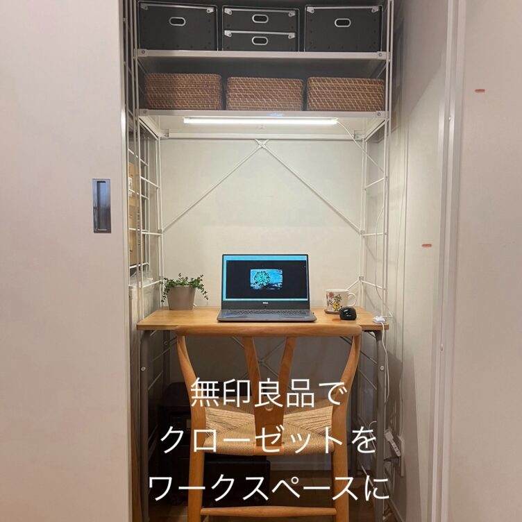 クローゼットをワークスペースに|無印良品のスチールユニットシェルフ+折りたたみスチールデスクで狭い場所でも快適なワークスペースが完成
